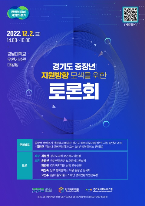 이번 토론회는 경기도에서 ‘경기 중장년 행복캠퍼스’와 ‘경기 중장년 마음돌봄 전화상담’ 등 중장년 사업을 운영하는 경기복지재단과 경기도사회서비스원 공동 주관으로 진행된다. 김정근 교수(강남대학교 실버산업학과 교수/경기 남부 행복캠퍼스 센터장)의 ‘통합적 생애주기 관점에서 바라본 경기도 중장년(베이비부머) 지원방향’ 발제로 시작한다.