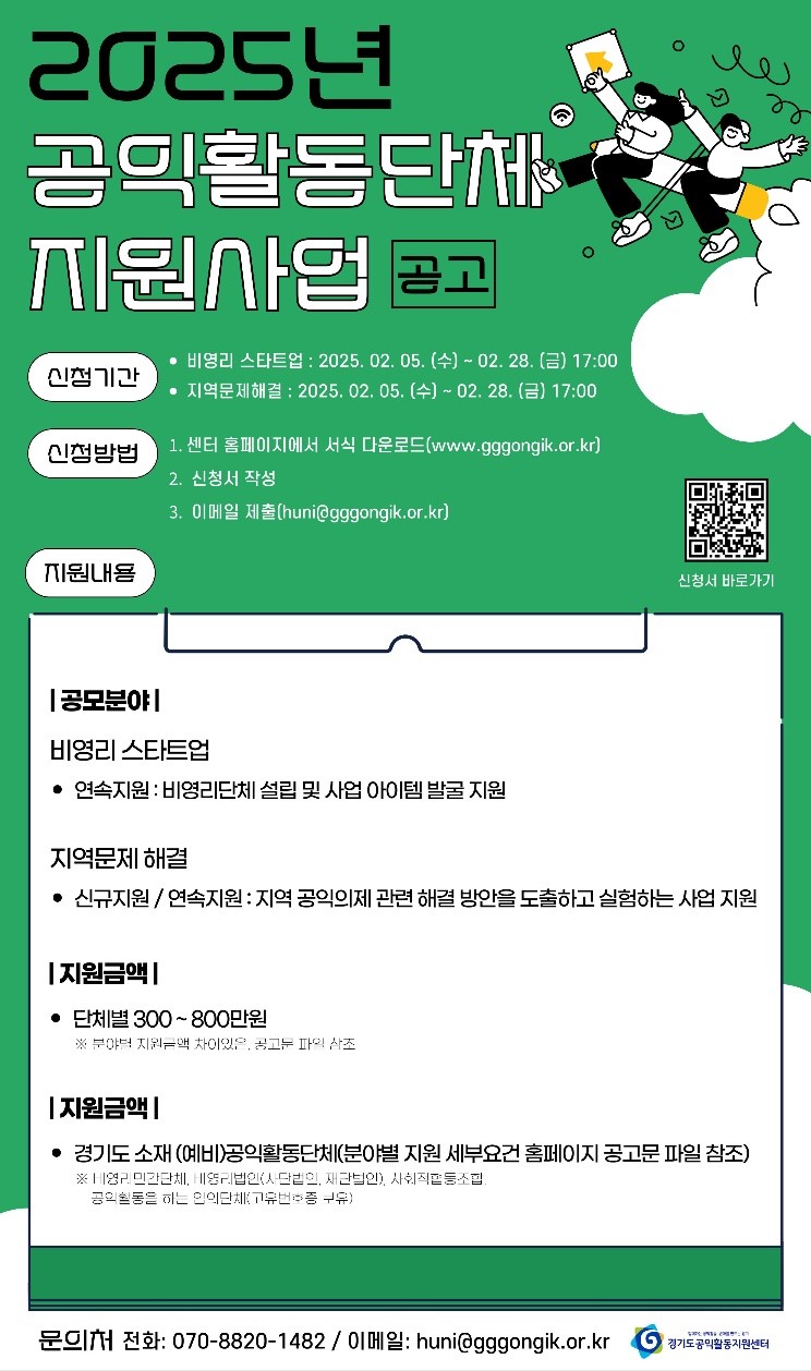 경기도공익활동지원센터는 도내 (예비)공익활동단체의 자율적·협력적 활동을 위해 ‘2025년 공익활동단체 지원사업’ 대상을 오는 28일까지 공개 모집한다.