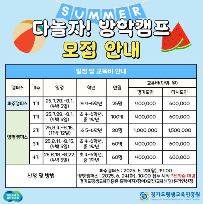캠프는 초등학교 4학년부터 중학교 1학년을 대상으로 경기미래교육 파주 캠퍼스와 양평 캠퍼스 2곳에서 진행된다. 파주 캠퍼스는 23일 오후 2시부터, 양평 캠퍼스는 24일 오전 10시부터 경기도평생교육진흥원 누리집을 통해 신청할 수 있다.